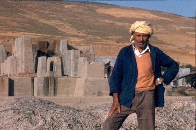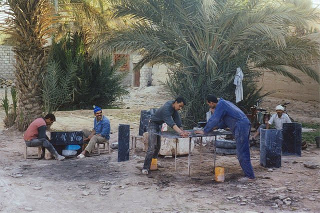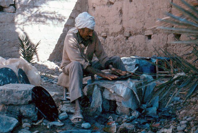 - Moving his work to stay in the shade Mustapha does the final polish on a fossilized marble dish.