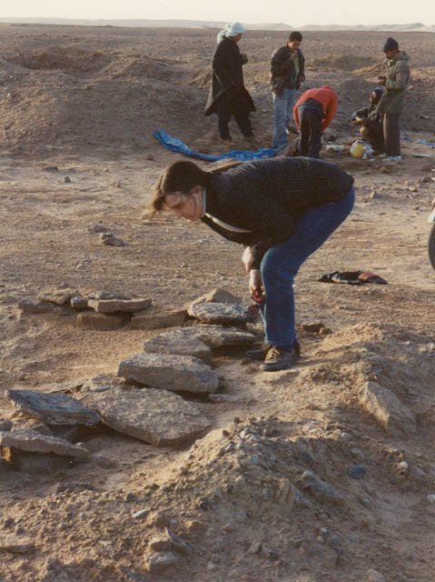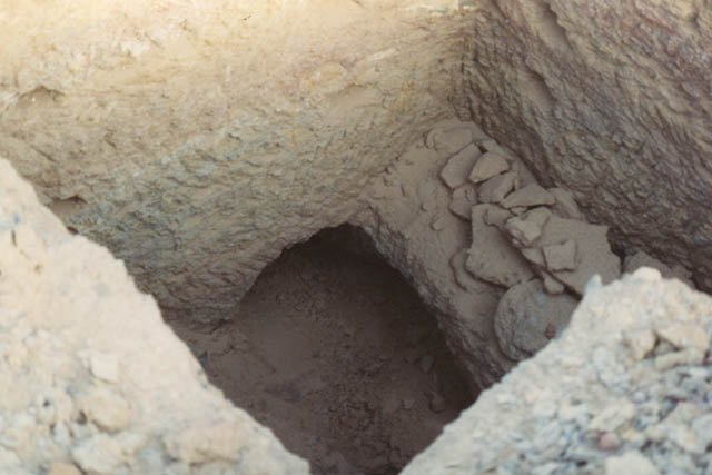 - Far out into the desert this pit was dug by hand to get to a layer of crinoids. This is difficult and sometimes dangerous work. It is seasonal, and the men only stay on the site for a few days at a time.
