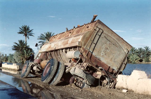 - One year it rained briefly but heavily in the desert. This photo is an example of a true "soft shoulder". There are serious accidents on the roads. We have had many near misses, but some of our friends have not been so lucky.