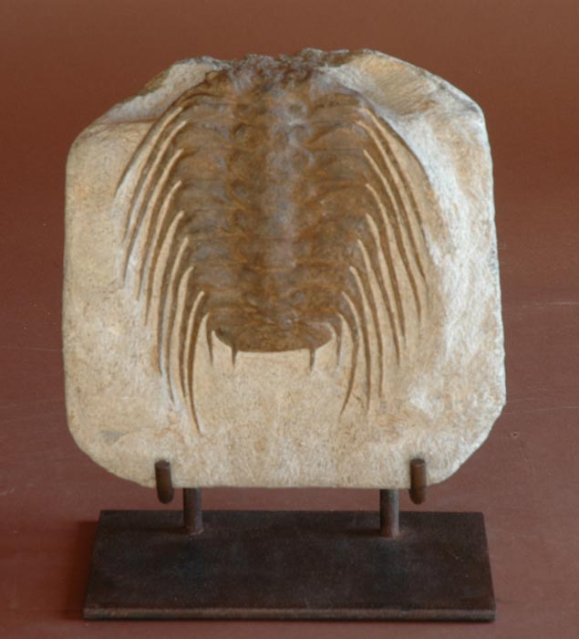 One of the oldest animal life forms on earth, flourished in the ancient primordial seas from the Cambrian Period beginning 570 million years ago to the Permian Period which ended approximately 230 million years ago. A possible descendant of these diverse arthropods is the Horseshoe Crab as well as the insect commonly known as "pill bug" which often defensively roll up their external skeleton - a trait shared by all trilobites. |